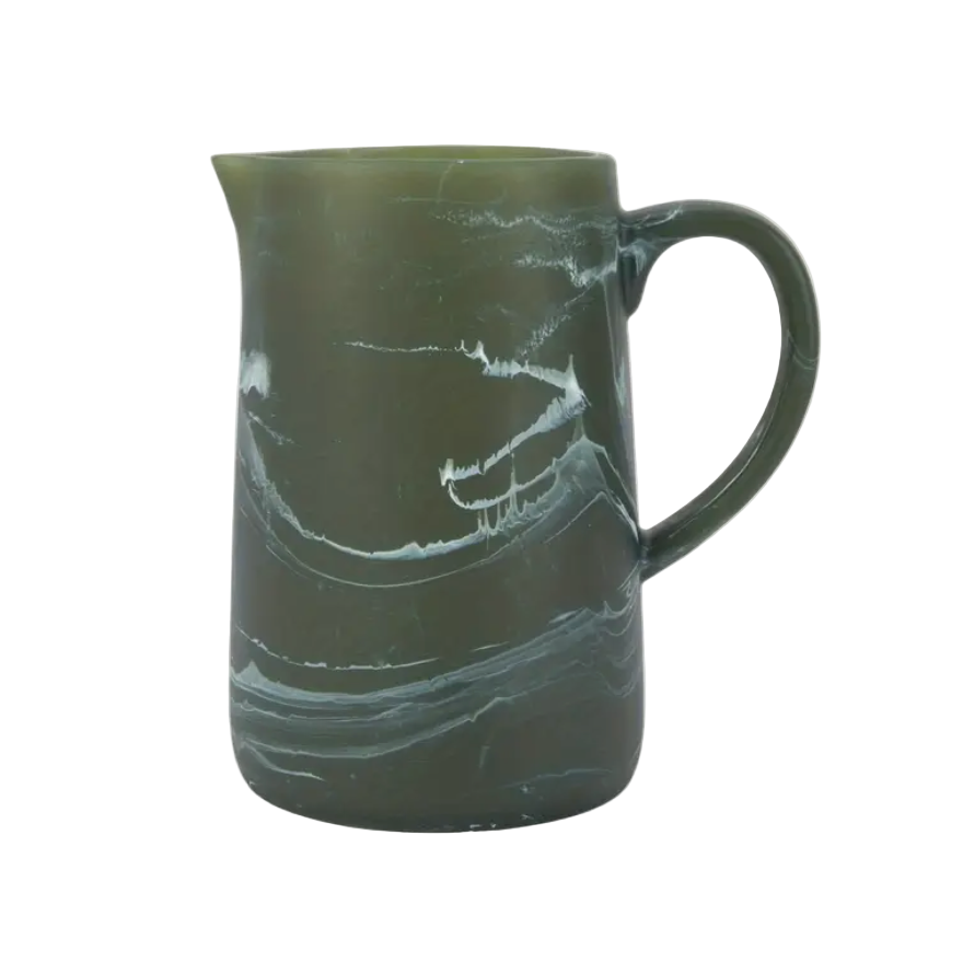 Jarra trabajada en resina. Mate. 19 x 18cm. Ideal para el agua, jugo o coctelería. Precio unitario. Acabado en resina marmoleado.