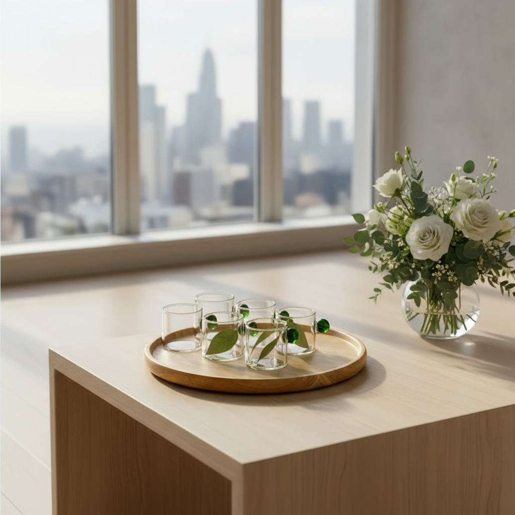 vaso en vidrio con detalle. 5 x 5cm. Ideal para un tequila o para tu espresso por la mañana. Precio incluye 4 piezas.